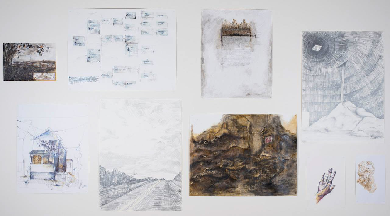 Untitled Grouping 6 (Clockwise from upper left): ballpoint, 8” x 13”; ballpoint, shellac, alcohol, 19” x 24”; ballpoint alcohol transfer, 30” x 22”; shellac, ballpoint, ink, acrylic, alcohol, 22” x 29”; graphite and shellac, 14” x 10”; graphite, shellac, 14" x 10”; gypsum, matte medium, pastel, ink, shellac, ballpoint, alcohol, 22” x 29”; graphite, watercolor pencil, 22” x 30”. 2016.